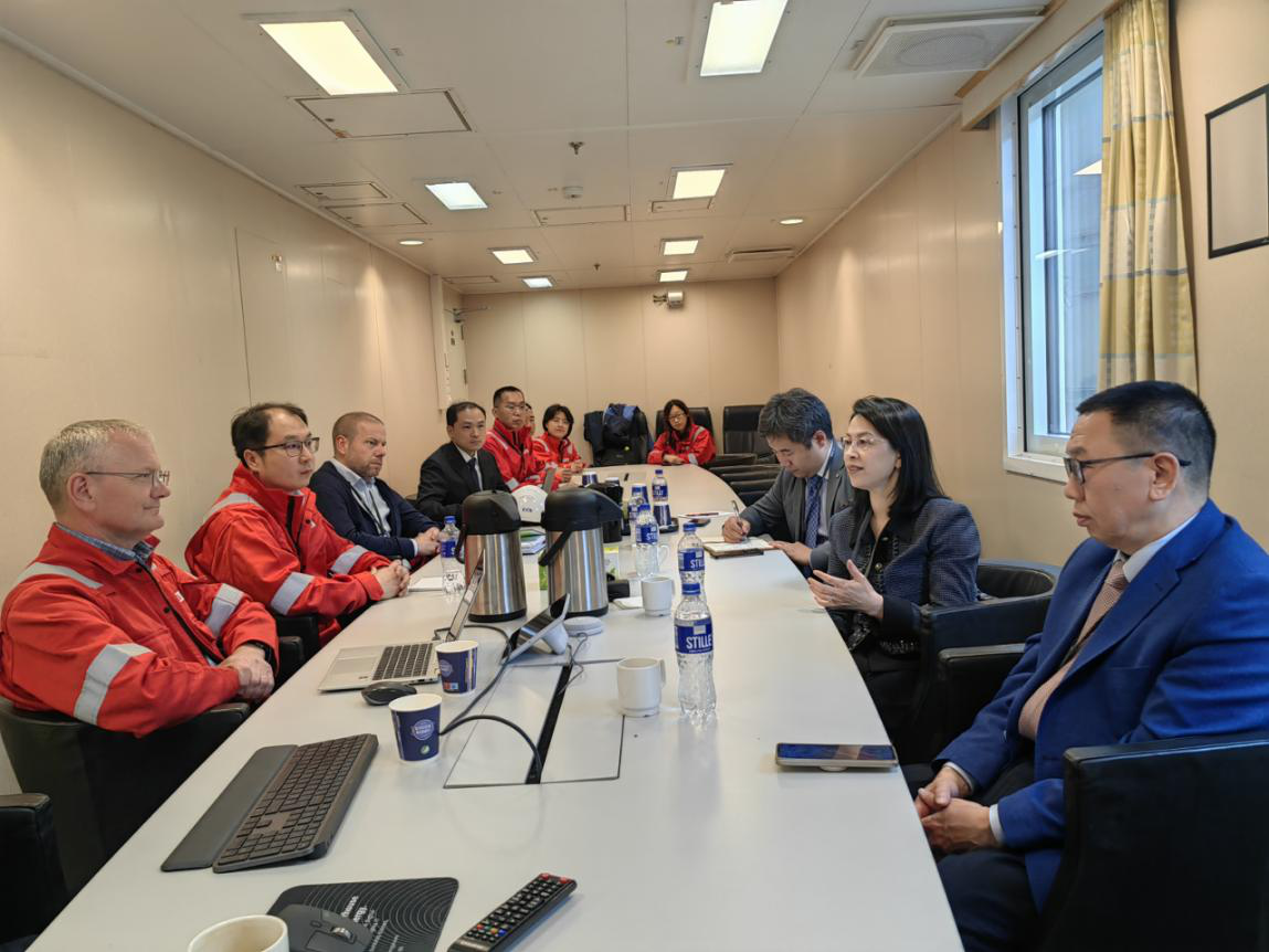 2024年6月13日,驻挪威大使侯悦考察中海油服钻井平台,并与中海油服欧洲钻井公司首席执行官托勒森(Frank Tollefsen)及中方负责人座谈。陈文林商务参赞陪同考察。
