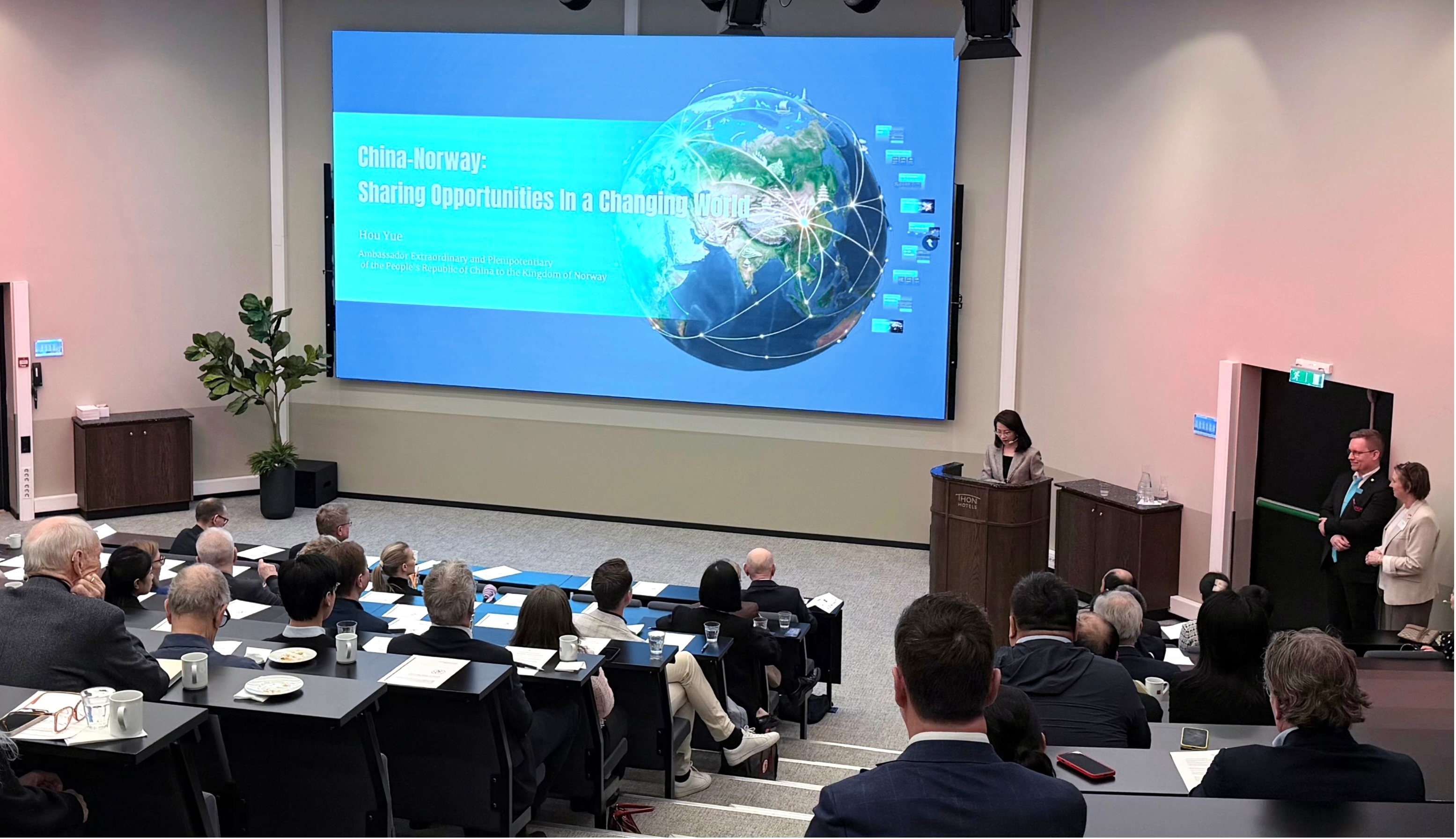 3月18日,驻挪威大使侯悦出席挪中商会会员大会并发表主旨演讲,宣介全国两会精神和“十五五”规划。挪工商界代表、智库学者、友好人士等60余人出席。